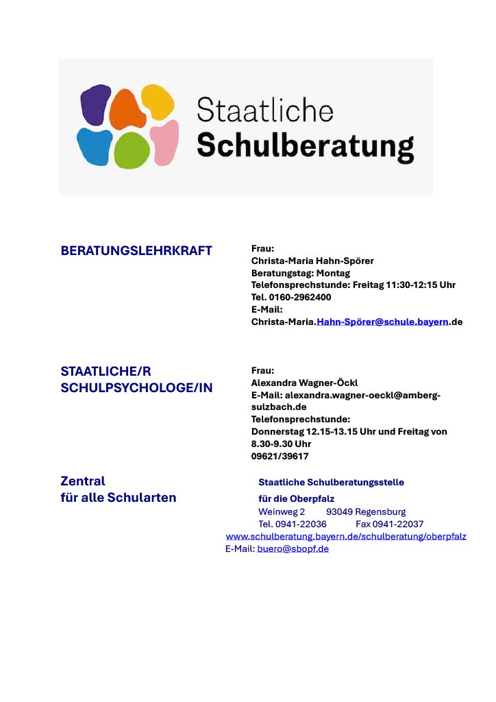 Raiffeisenstraße 2a, 92224 Amberg, Fragen der Schullaufbahnberatung, Diagnostik, Dyskalkulie, Einschulung und zu auffälligem Verhalten: Frau Anja Schneider, StRin FöS.